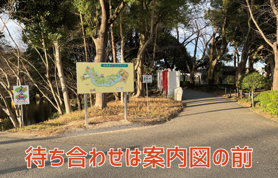 待ち合わせ場所は大きな遊具(すべり台)のそばにある大きな看板、公園案内図の前です。